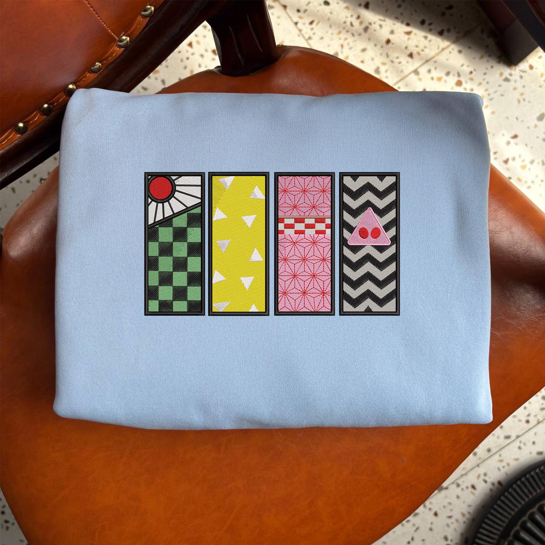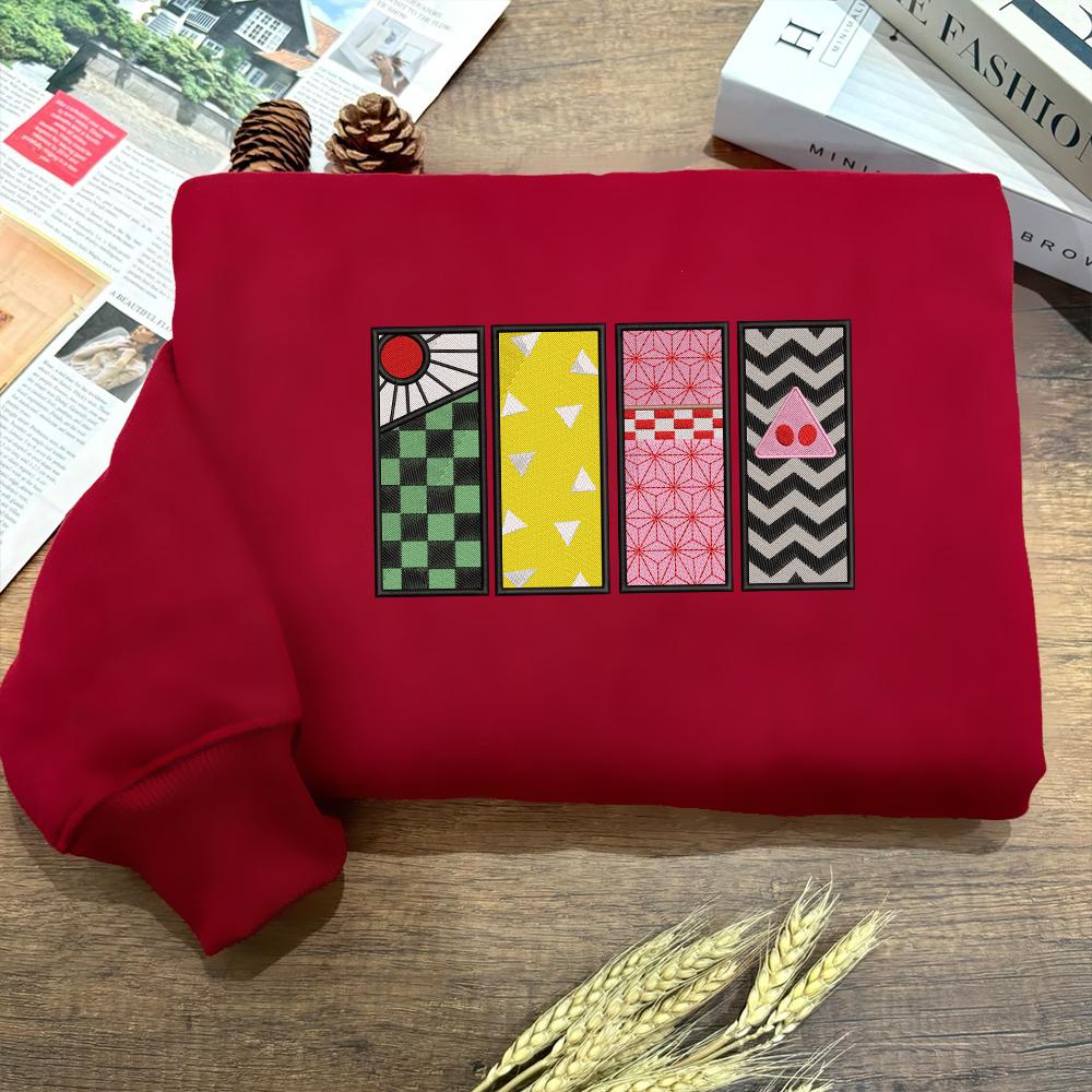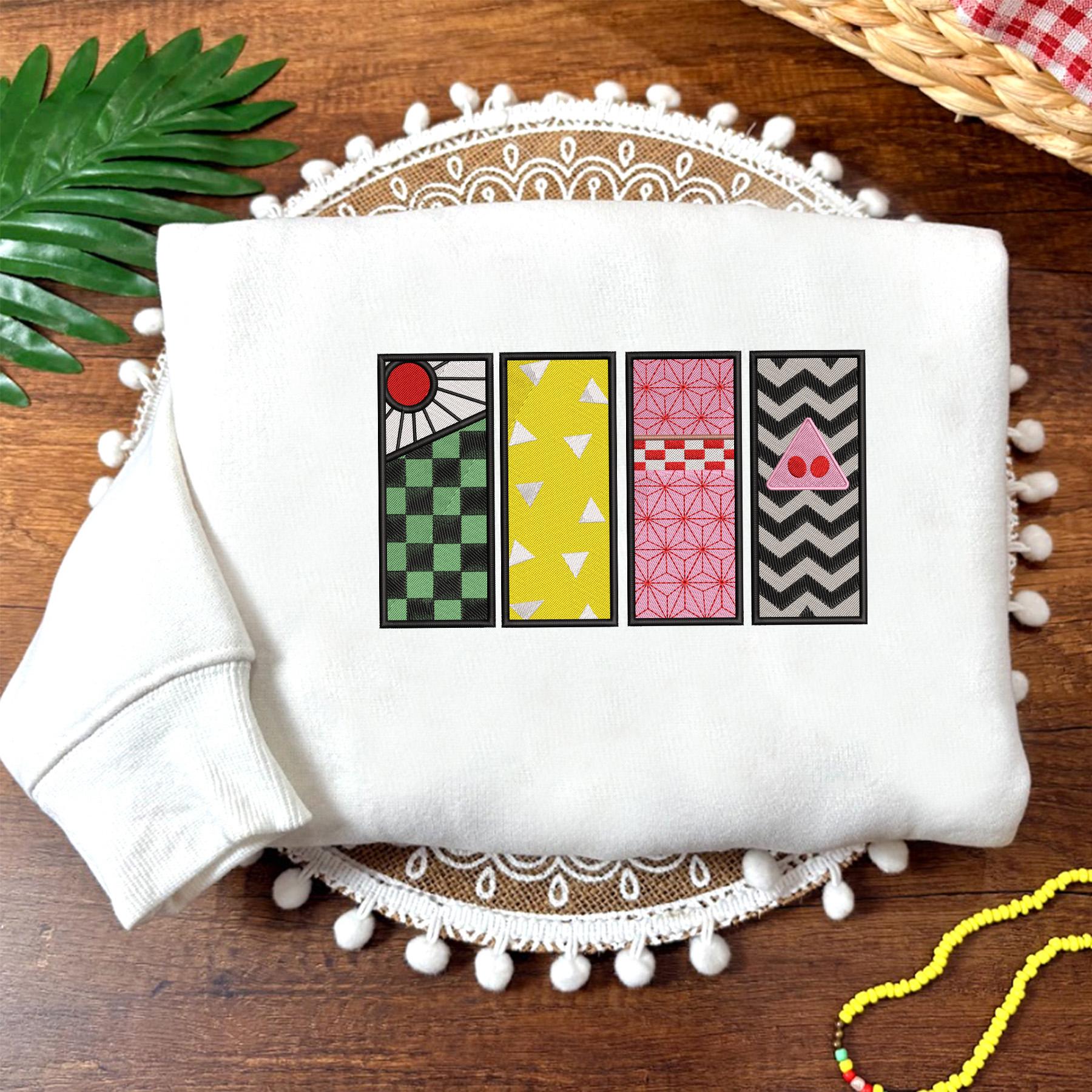 Celebrate your love for Demon Slayer in the most stylish and subtle way! This cozy embroidered sweatshirt features four iconic kimono patterns inspired by Tanjiro, Zenitsu, Nezuko, and Inosuke—each stitched in crisp, colorful detail.