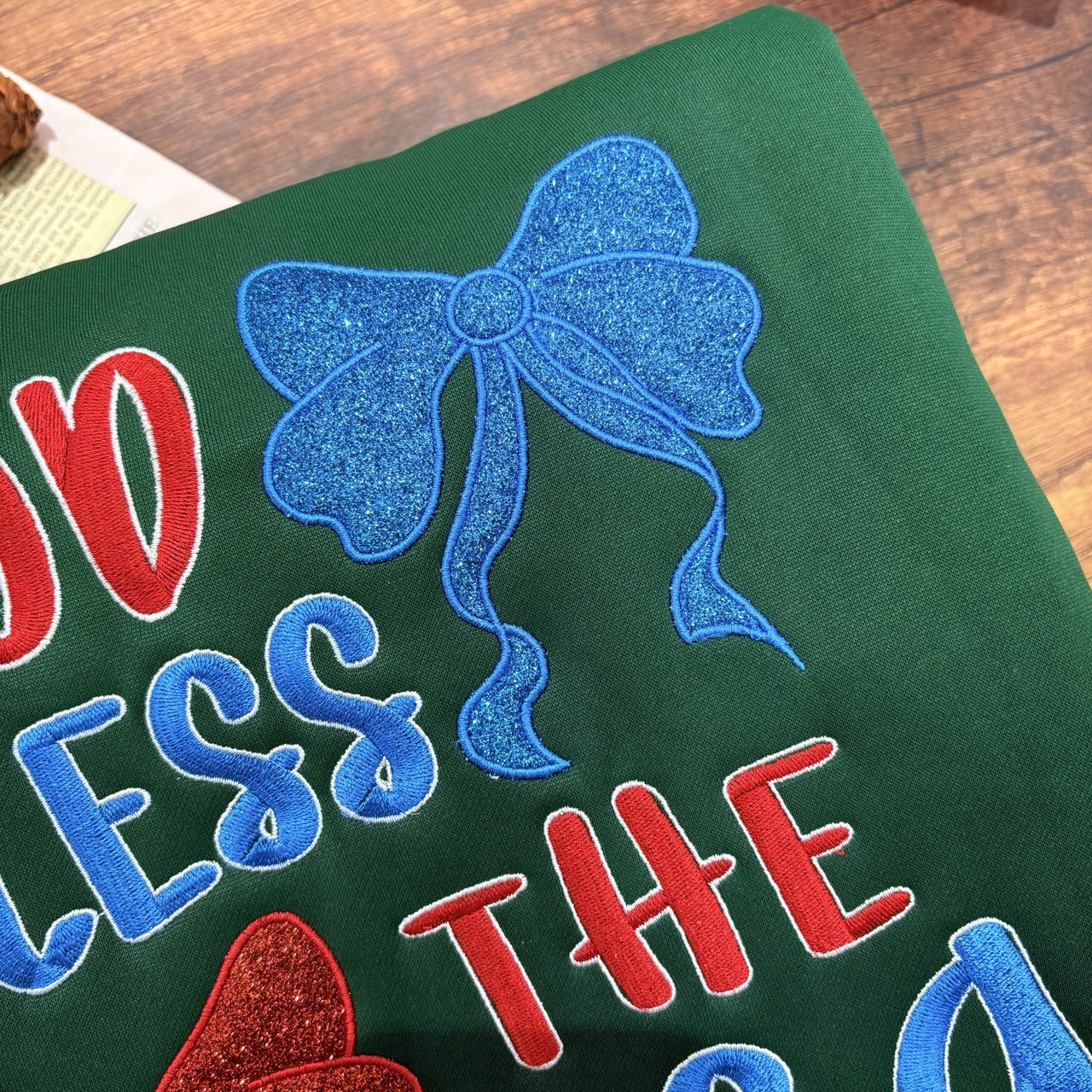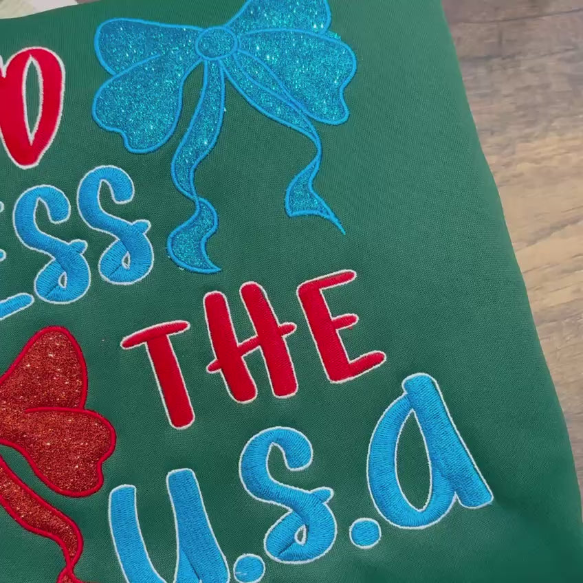 Celebrate your love for the country with our "God Bless the U.S.A." embroidered sweatshirt! Featuring vibrant bows and a bold design, this sweatshirt is perfect for Independence Day celebrations, family gatherings, or everyday wear.