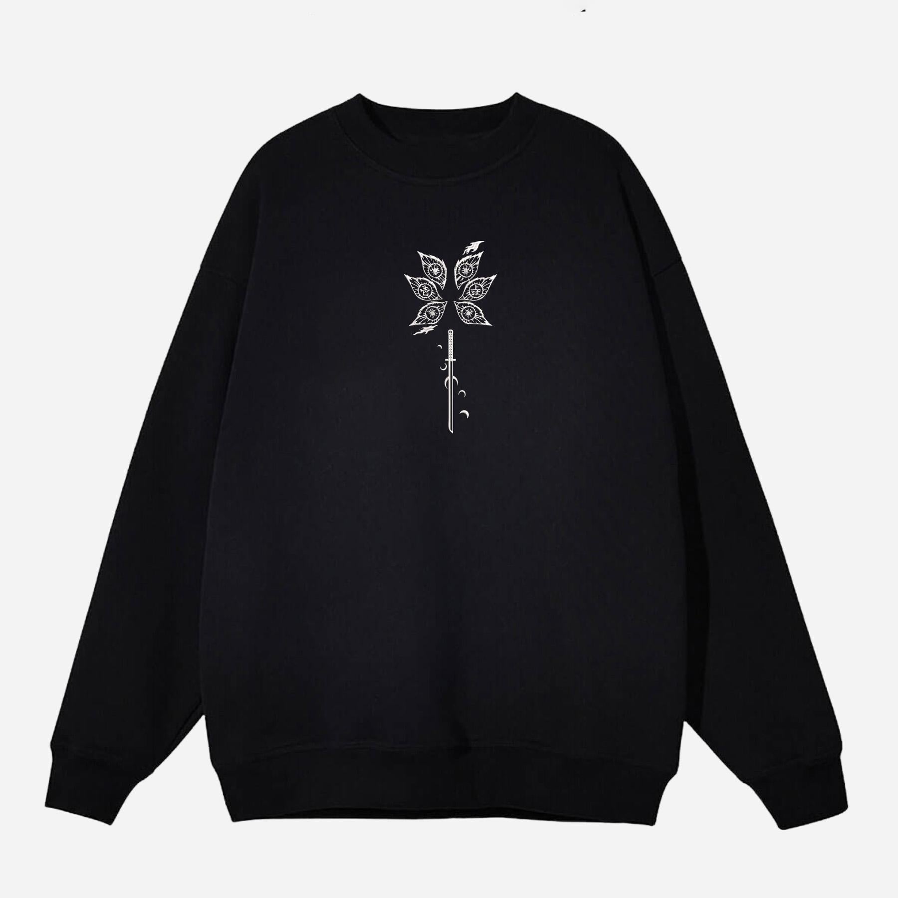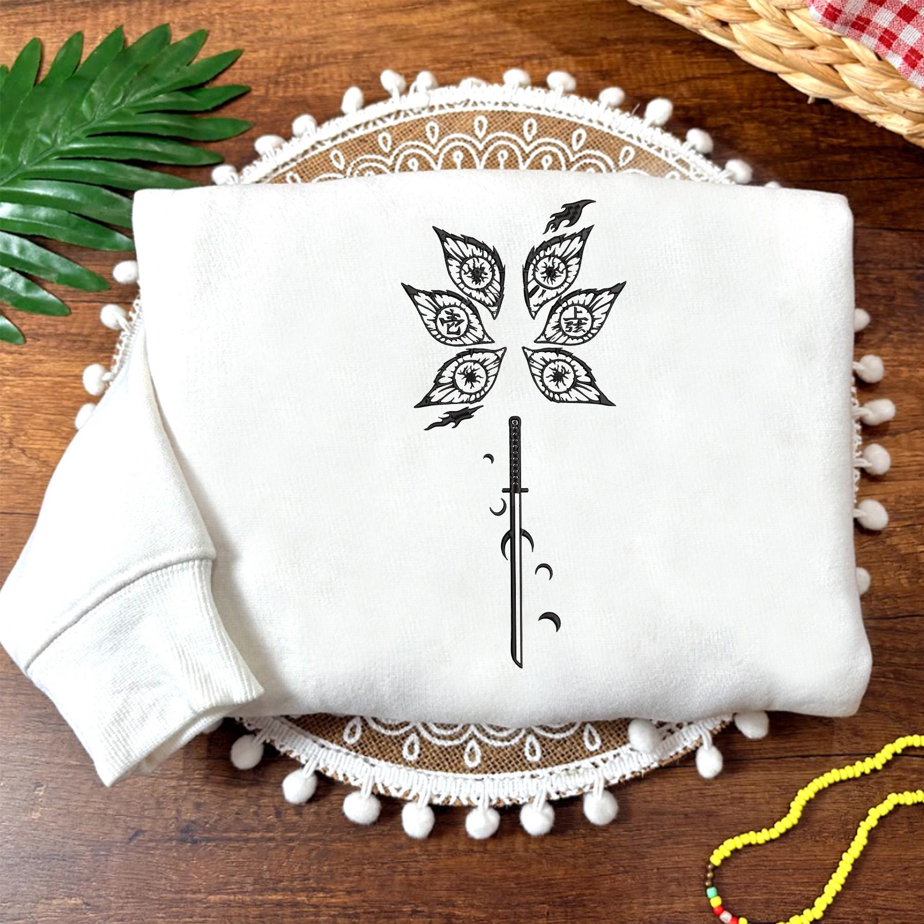 Channel the chilling presence of the Upper Moon One with this striking embroidered sweatshirt. The design features five demonic eyes arranged in a fan-like formation, with a lone Nichirin blade pointed downward — a subtle nod to Kokushibo, the fearsome demon swordsman from Demon Slayer.