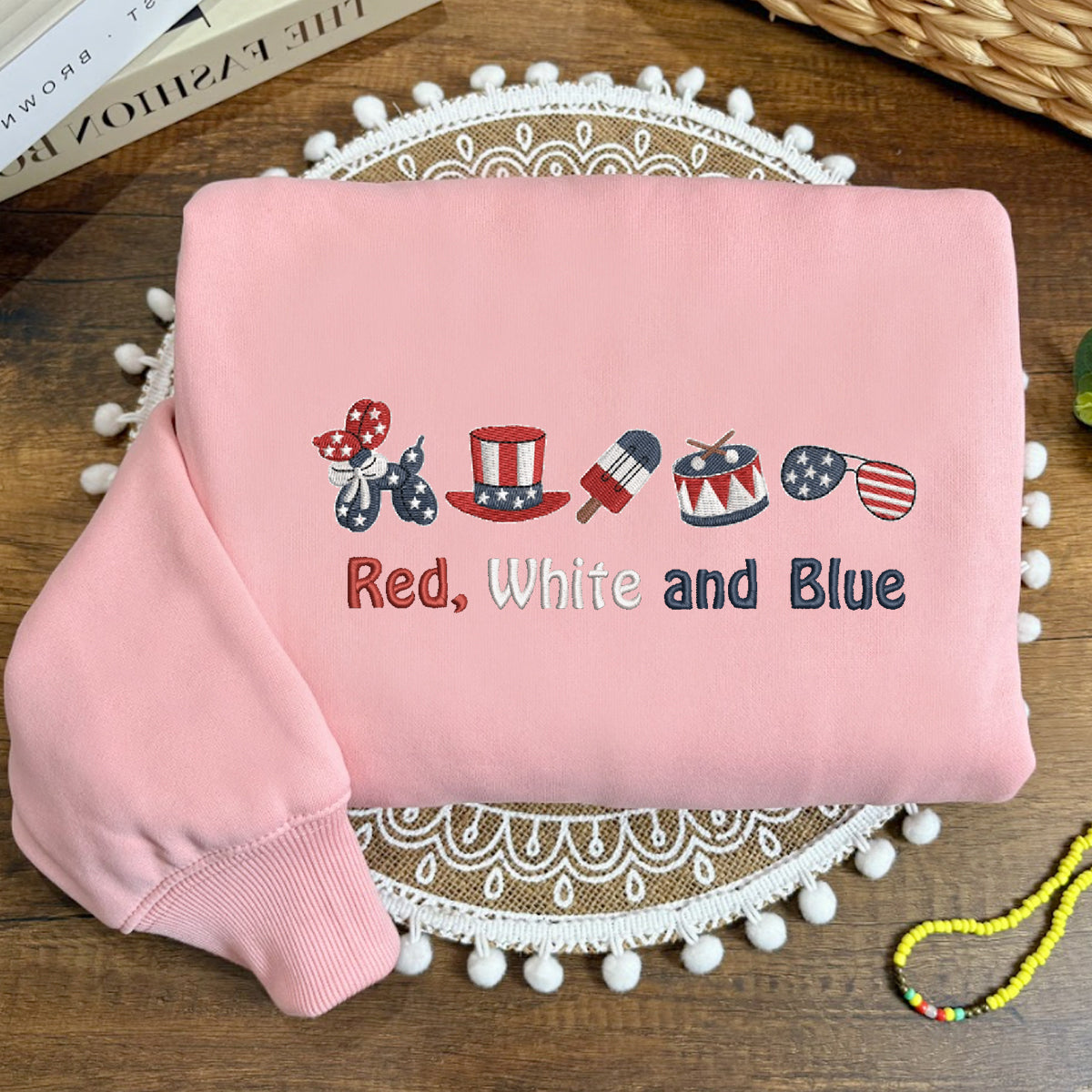 Celebrate your patriotic spirit in the cutest way possible with this festive “Red, White and Blue” sweatshirt! Featuring a beautifully embroidered row of Americana icons – from bows and top hats to popsicles and drums – this cozy pullover is perfect for the 4th of July, Memorial Day, or any red-white-and-blue kind of day.