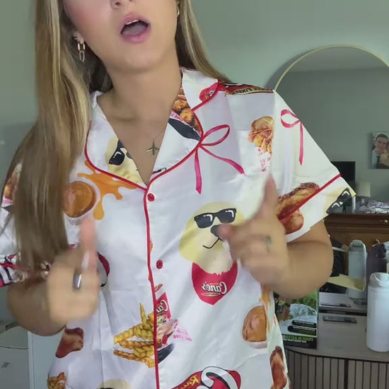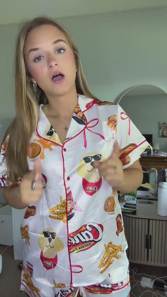 Bring a playful twist to your bedtime routine with the Raising Chickens Satin Pajama Set 🐔✨. Perfect for cozy nights or lounging around, this set is made with soft, silky satin fabric that feels smooth on the skin while showing off an eye-catching chicken & farmcore inspired design.