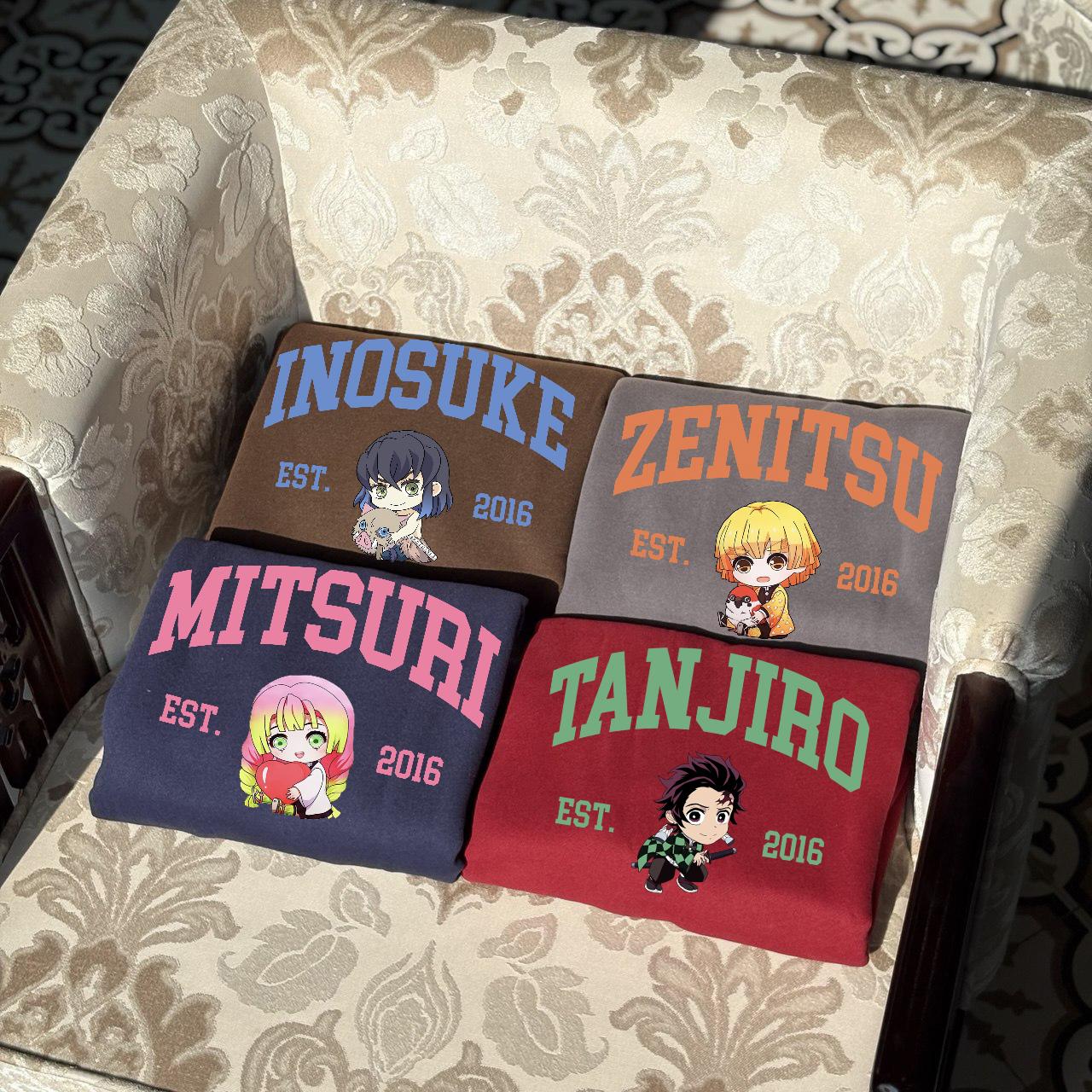 🖤 Anime-Inspired Chibi Character Shirt – Demon Slayer Edition Show off your favorite slayers and demons in the cutest way possible! These printed tees feature chibi versions of iconic characters from the hit anime series, paired with bold varsity-style text and “EST. 2016” — the year Demon Slayer began its journey.
