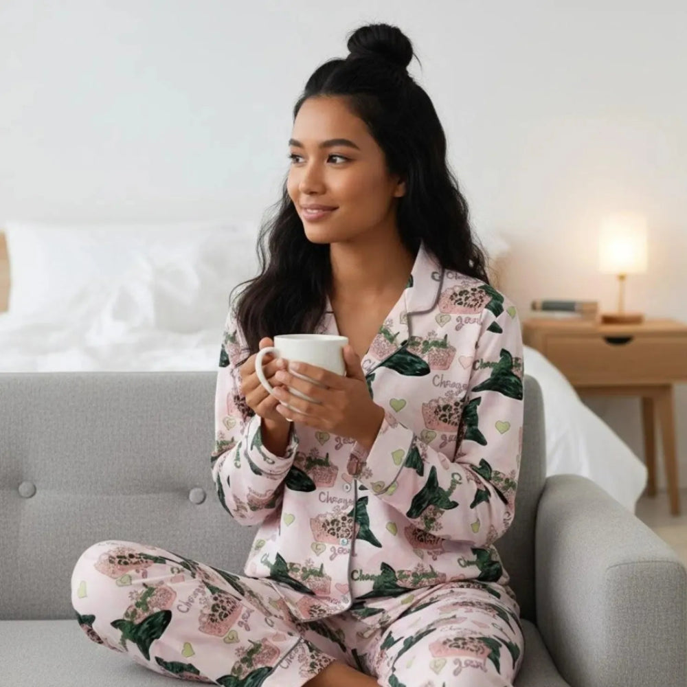 Buttery-soft, lightweight fabric that feels like a dream against your skin — breathable for year-round wear, with a classic button-up long-sleeve top + full-length pants (elastic waist for comfy fit).